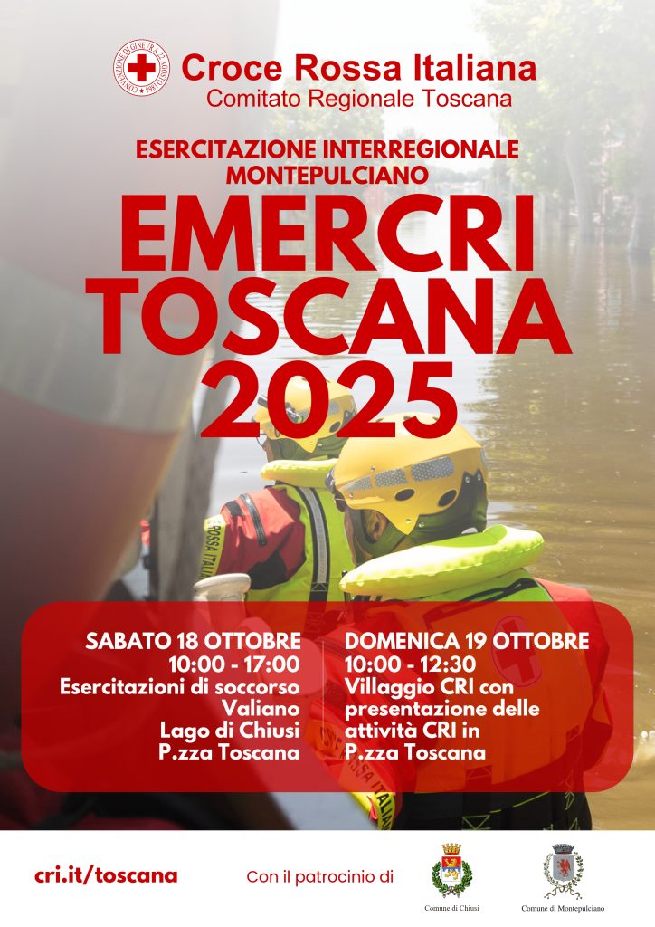Sabato 18 ottobre, dalle ore 10:00 alle ore 17:00, sono previste esercitazioni di soccorso in Piazza Toscana a Montepulciano Stazione, a Valiano e nel Comune di Chiusi; domenica 19 ottobre, dalle ore 10:00 alle ore 12:30, in Piazza Toscana sarà allestito un villaggio della Croce Rossa, con dimostrazioni delle varie attività.