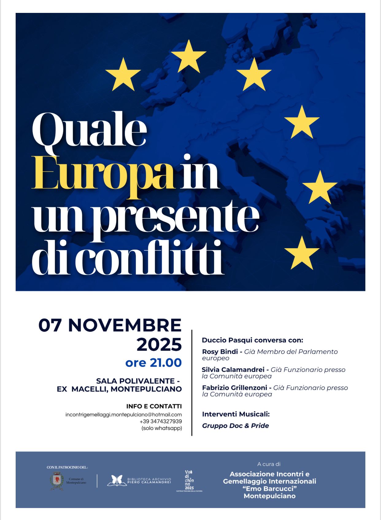 La riflessione su questi temi proseguirà il giorno seguente, quando, alle ore 21:00, agli Ex Macelli è in programma l’incontro di approfondimento “Quale Europa in un presente di conflitti”, promosso dall’Associazione Incontri e Gemellaggi Internazionali Emo Barcucci, con la partecipazione, tra gli altri, di Rosy Bindi, Silvia Calamandrei e Fabrizio Grillenzoni. Nel corso dell’iniziativa, gli ospiti dialogheranno con Duccio Pasqui sul ruolo dell’Europa come attore geopolitico e sulle difficoltà che le impediscono di prendere l'iniziativa nella risoluzione dei conflitti di questo tempo. Agli interventi si alterneranno alcuni brani dedicati alla pace a cura del gruppo musicale Doc&Pride.