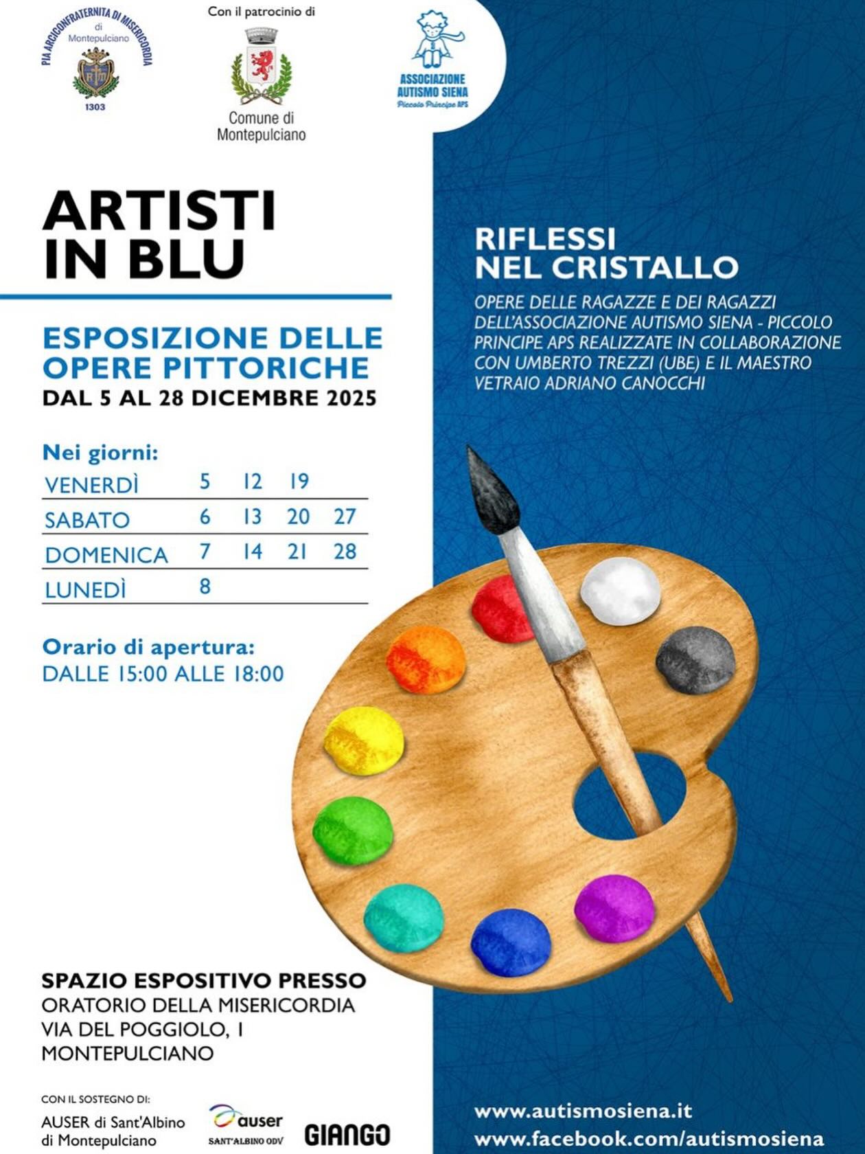 Il mese di dicembre a Montepulciano si arricchisce con la nuova edizione di Artisti in Blu, la mostra dedicata ai lavori creativi delle ragazze e dei ragazzi dell’Associazione Autismo Siena – Piccolo Principe APS. L’esposizione, patrocinata dal Comune di Montepulciano e dalla Fraternita di Misericordia di Montepulciano, sarà visitabile dal 5 al 28 dicembre 2025 presso lo spazio espositivo dell’Oratorio della Misericordia, in Via del Poggiolo 1, a pochi passi da Piazza Grande.